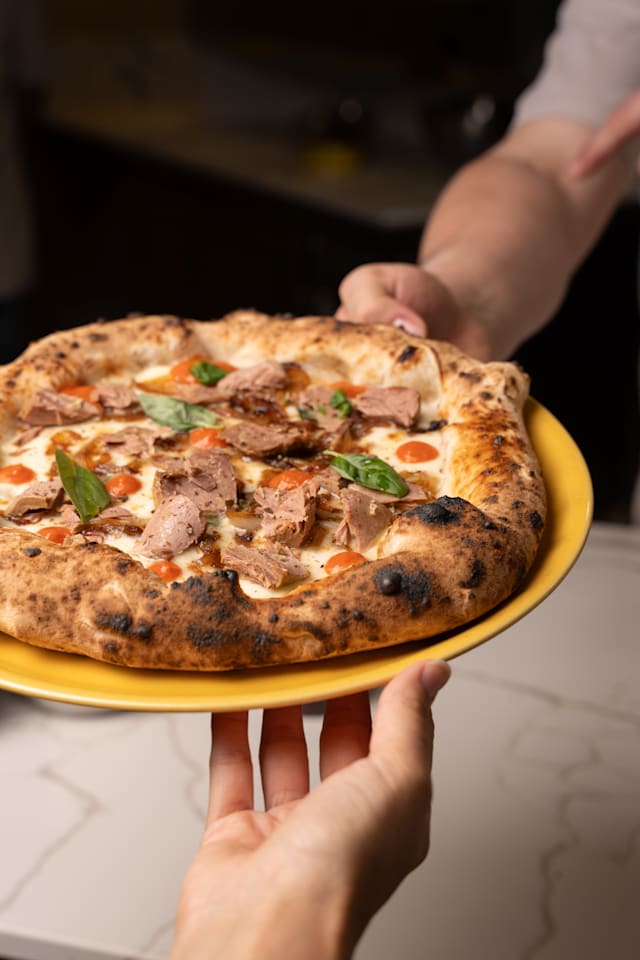 - Pomodoro san marzano, salame di tramonti, fior di latte, gorgonzola, nduja di spilinga, basilico, olio EVO hirpinia