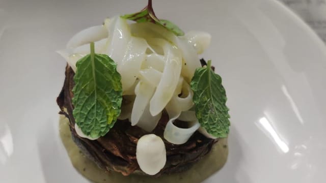 Tentacolo di piovra glassato, aglio nero e basilico con carota di san vito in due consistenze