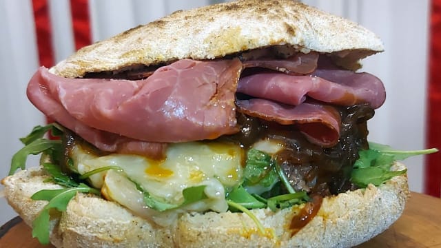 Svizzera di scottona locale, pastrami, caciocavallo, cipolla smoked jack daniels, rucola, lamelle di mandorle, salsa made in gusto