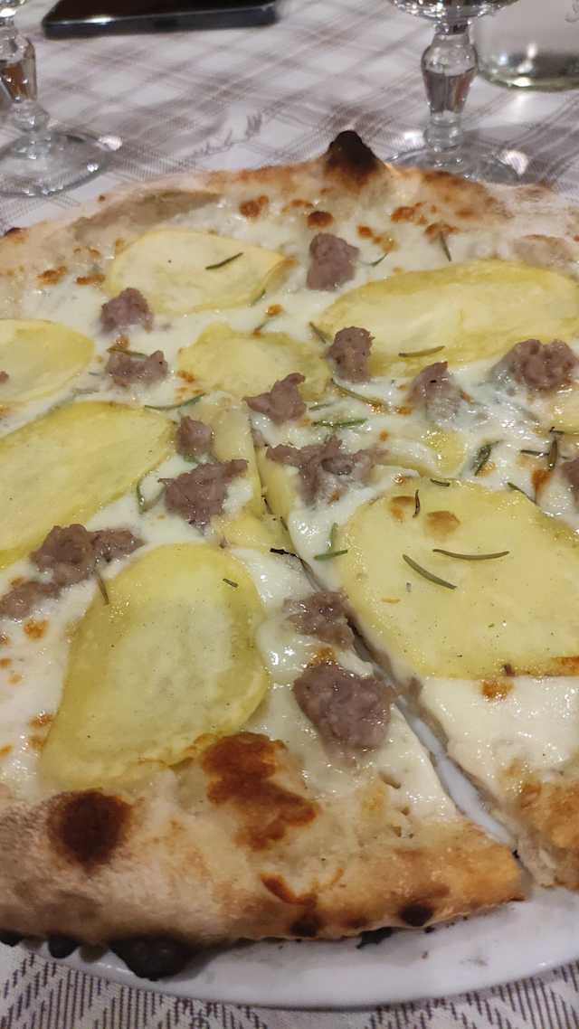 Pinza base mozzarella e un tripudio di verdure come omaggio alle "virtù" teramane: patate, zucchine, cime di rapa, cicoria, peperoni, cipolla. A completare la composizione una macinata di pepe nero fresco.