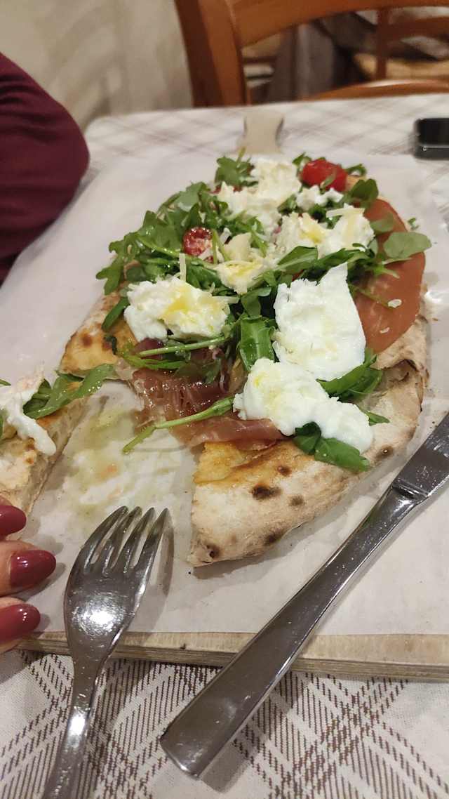 Focaccia con prosciutto crudo, mozzarella di bufala dop stracciata a crudo e la freschezza del connubio perfetto tra rucola, pomodoro pachino e grana sfilettato.