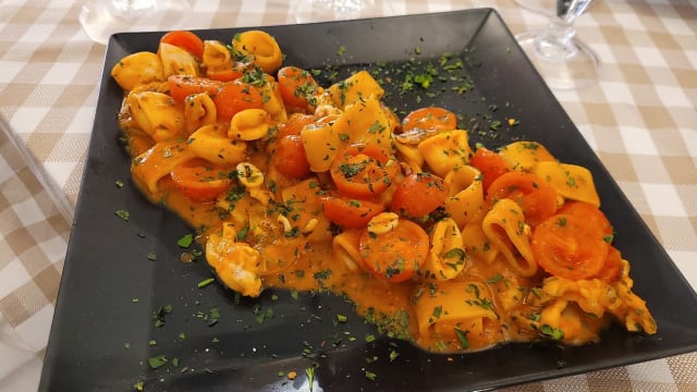 Ravioli ricotta e basilico con: pomodoro parmigiano reggiano e basilico