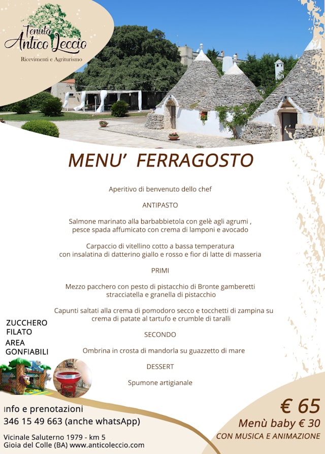 ApulianEuropeanItalianGood for familiesOutdoor diningWith friendsVegan dishesVegetarian dishesDog-FriendlyWheelchair AccessibleWifi
