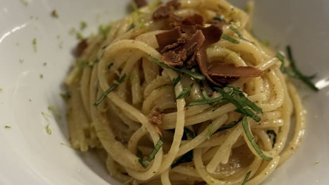 Spaghetti cacio e pepe con tartare di gambero rosso di mazara
