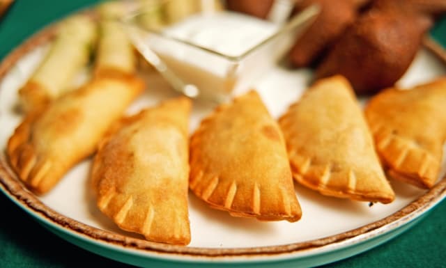 Empanadillas rellenas de carne picada y nueces. Servidas con salsa de yogur.
