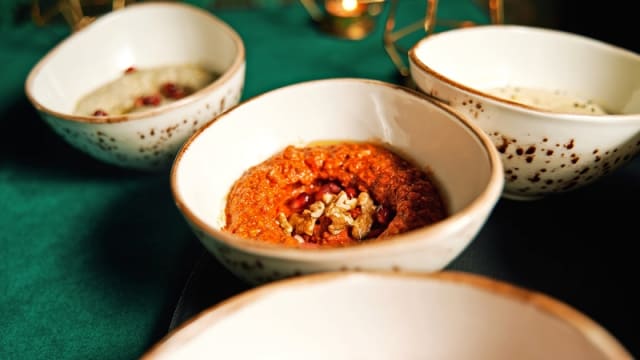 Hummus, mutabal, muhammara, labne y tajin mutabal.