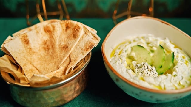 Crema de garbanzos con tahina, limón y aceite de oliva virgen extra.
