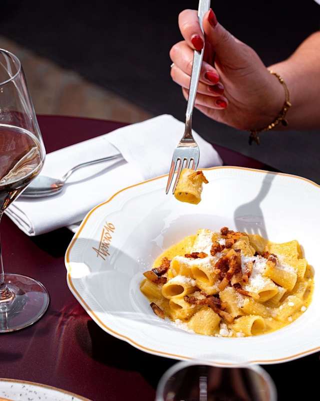 - Mezza manica fresca acqua e farina, guanciale di bassiano croccante, crema all'uovo, pecorino romano, pepe nero
