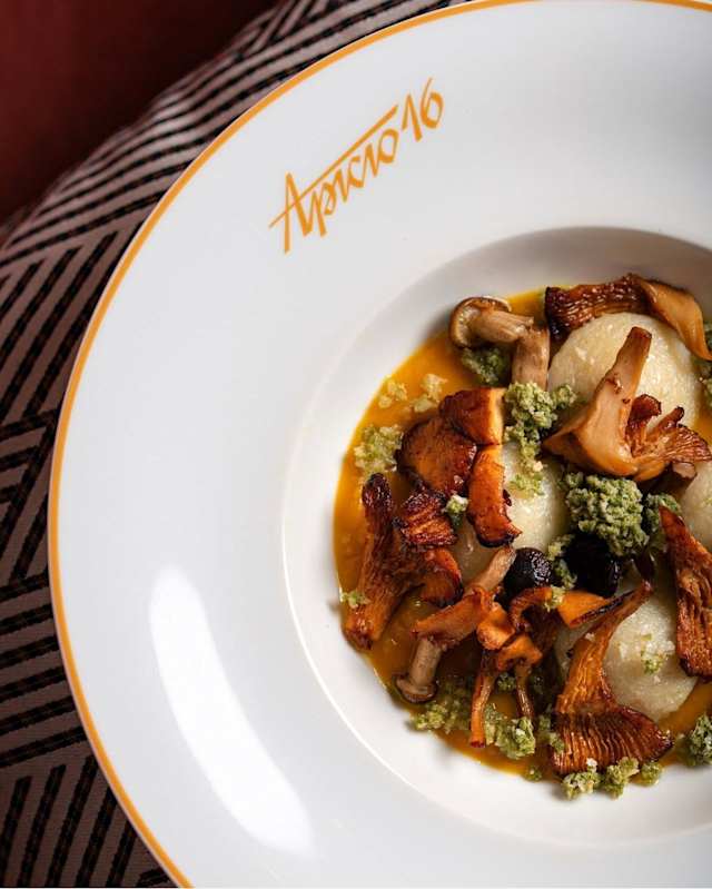 - Gnocco di patate ripieno di blu del moncenisio, crema di zucca, funghi di stagione e crumble al prezzemolo
