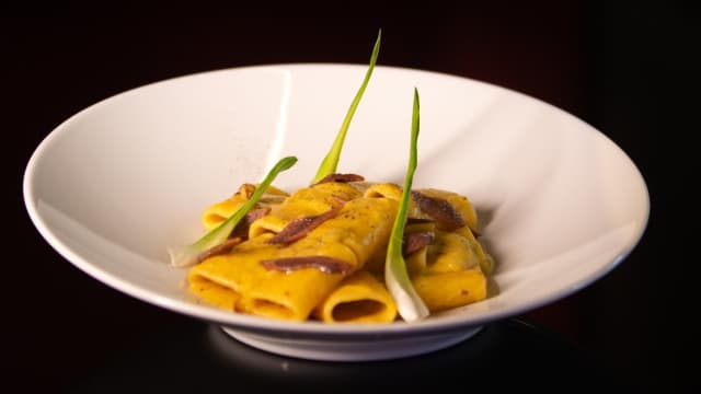 Paccheri rigati, salsa Cacio e pepe, tartare di gamberi rossi e carciofi fritti.