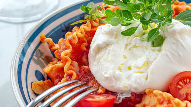 - Base tomate, tomates, copeaux de grana padano, burrata, basilic frais
