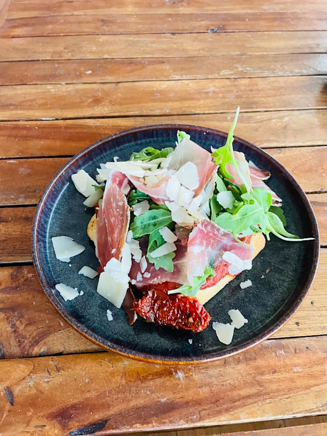- Salade de roquette, mozzarella fondante, tomate, jambon de parme, crème de balsamique.