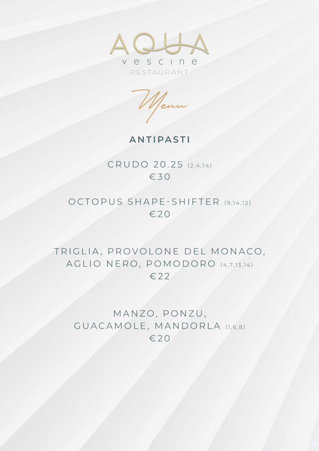 10/10+1Dinner at Aqua Vescine was seriously next level. We felt like we were dining in a Michelin-starred restaurant — from start to finish. The service was kind, professional, and made us feel truly welcomed. The food? Incredible. The rice dish was creamy, full of flavor, and perfectly balanced. The grilled course was just as impressive — juicy, rich, and cooked with real precision. Every plate looked like a work of art, but nothing felt overdone. It was elegant, exciting, and genuinely delicious. We left the table with a smile, feeling like we had experienced something really special. If this isn’t Michelin material, I don’t know what is.