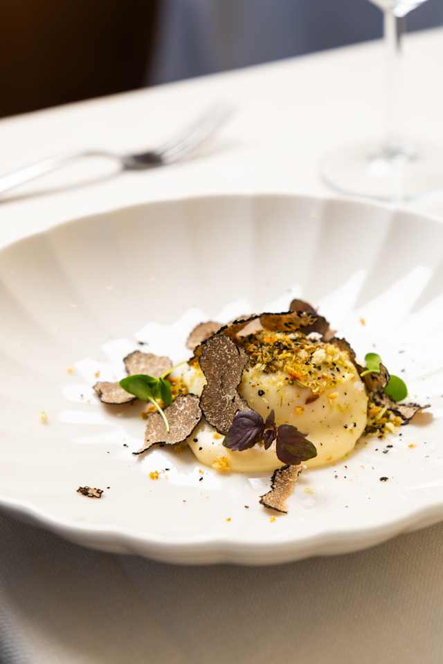 - Uovo sous vide con fonduta di parmigiano, crumble di pane alle erbe e tartufo nero