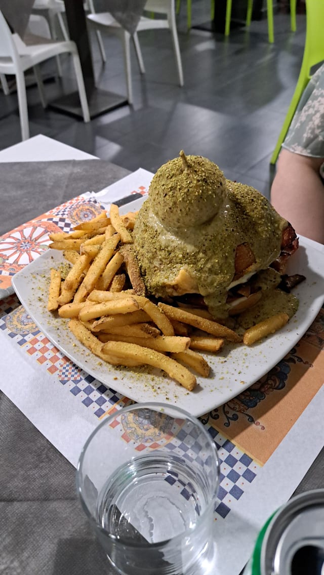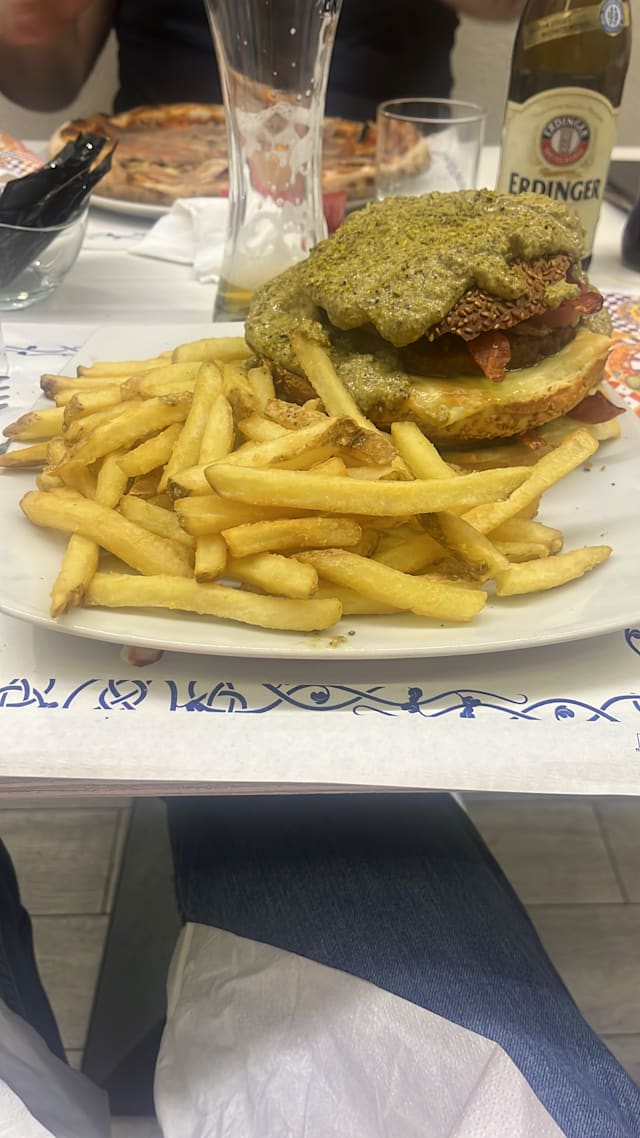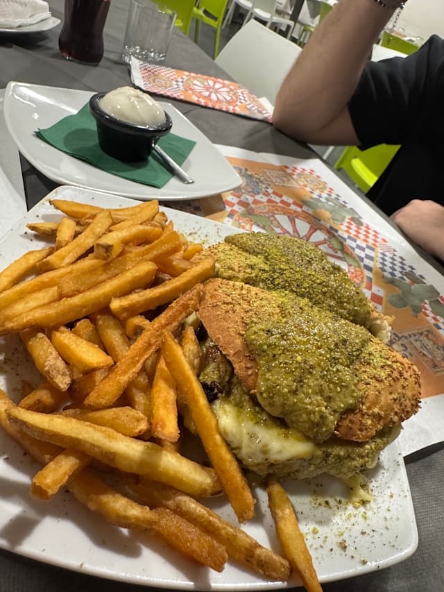 2 hamburger di vitello 200gr, formaggio, bacon, pom, crema di pistacchio