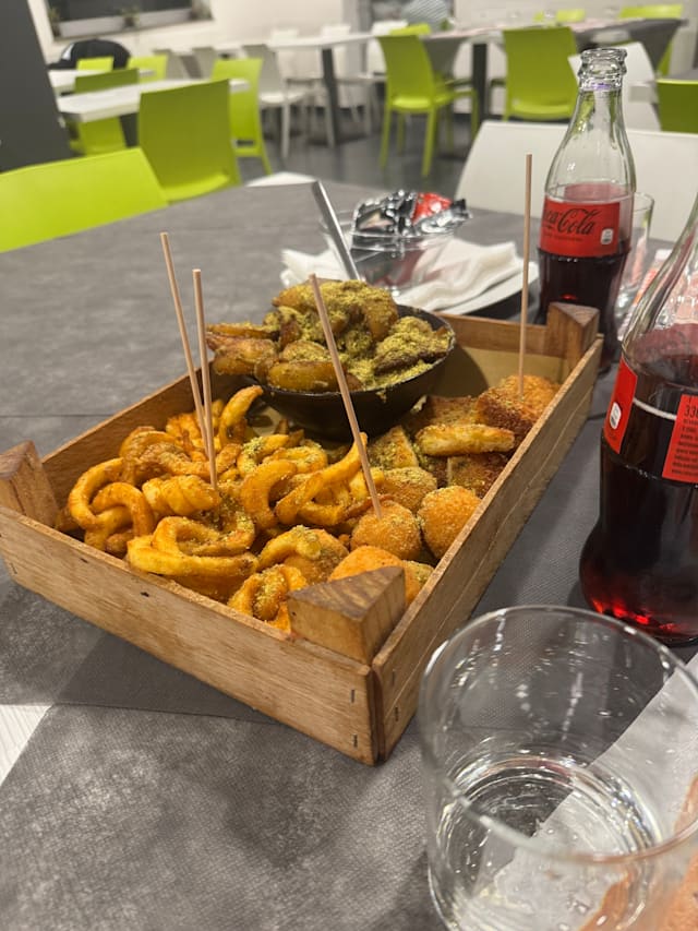 Arancinetti al pistacchio,mozzarella in carozza al pistacchio, verdure pastellate, tuma fritta al pistacchio, patatine fritte al pistacchio, servito