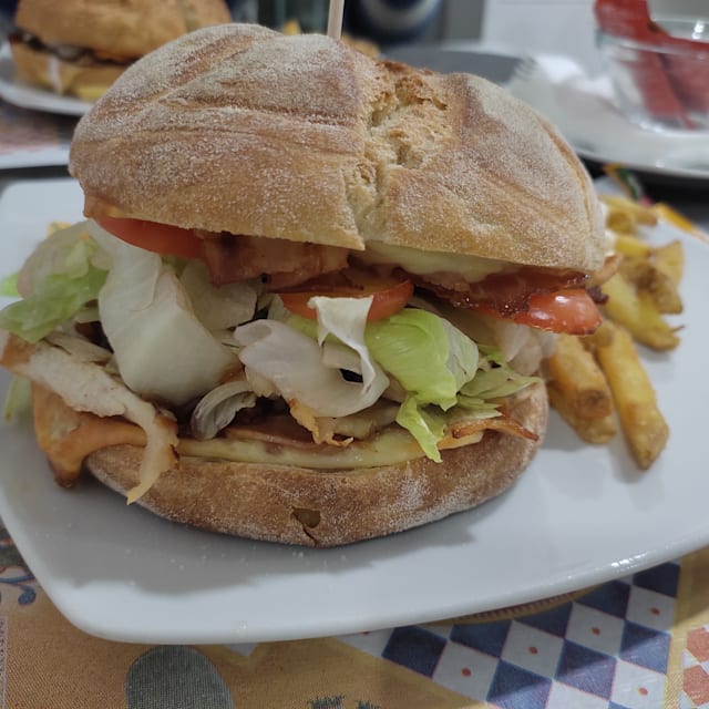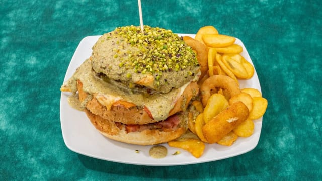 2 Hamburger di vitello 200gr, formaggio, bacon, pomodoro, crema di pistacchio, servito con chips croccanti e salse