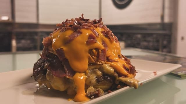 Doble smash burger con bacon y queso cheddar, recubierta con una capa extra de cheddar derretido y coronada con virutas de bacon. Pura devoción al queso.