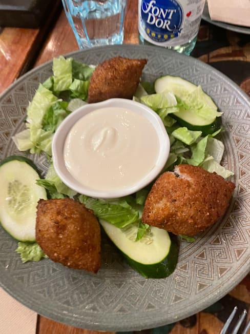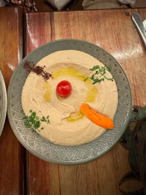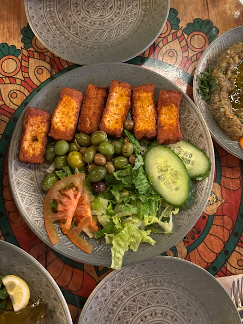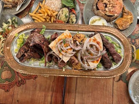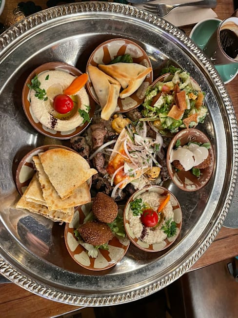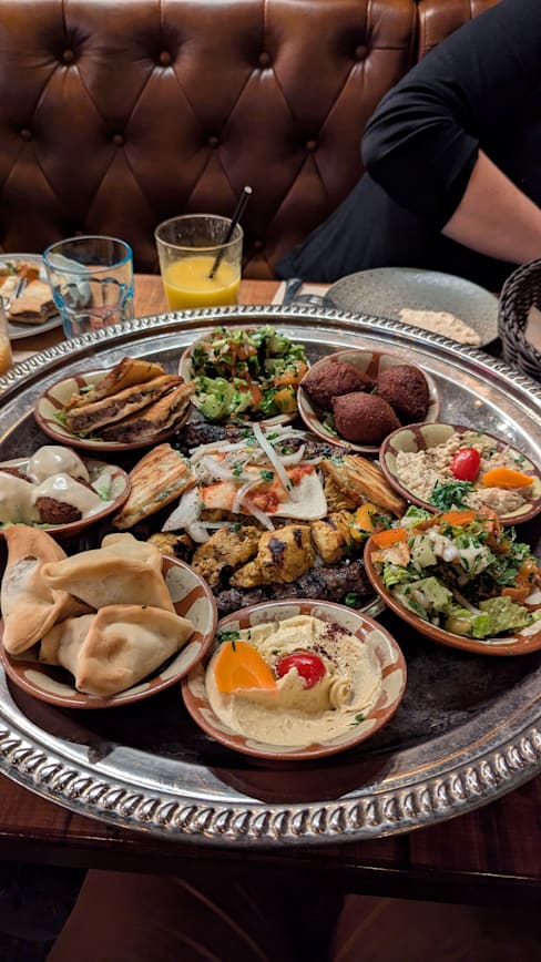 7.5/10The restaurant has a large, spacious interior, which is quite inviting. However, the service is rather slow, with the staff appearing unhurried and taking their time. We ordered the assortment platter for two, priced at €58. It came with a variety of small plates and dishes. The hummus was excellent, while the salad was overly acidic, with too much vinegar. The meat platter was a mixed experience – the meat was on the tough side, and the lamb had an overpowering lamb flavor, which may not suit everyone’s taste. Overall, I’d rate the food a 4 out of 5 and the service a 3 out of 5. It’s a decent experience, but there’s room for improvement.
