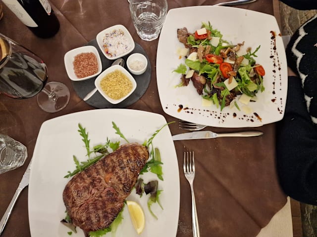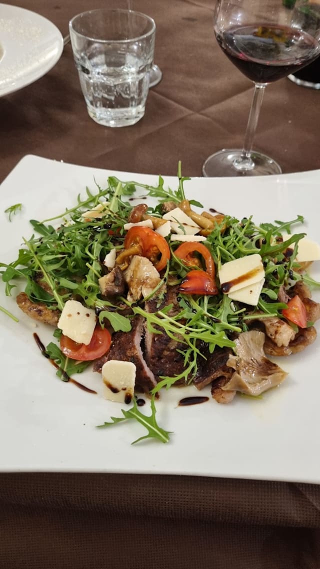 Tagliata di manzo con funghi, rucola, pomodorini pachino e scaglie di grana