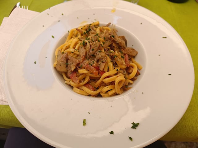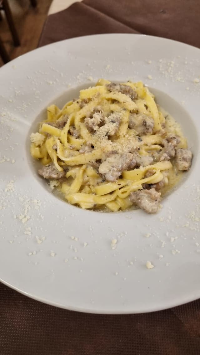 Pasta fresca all'uovo con Crema al tartufo, pasta di salsiccia