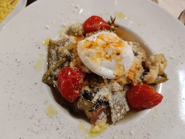 crostino toscano di fegatini, pomodorini basilico e acciughe, cicoria e salsiccia