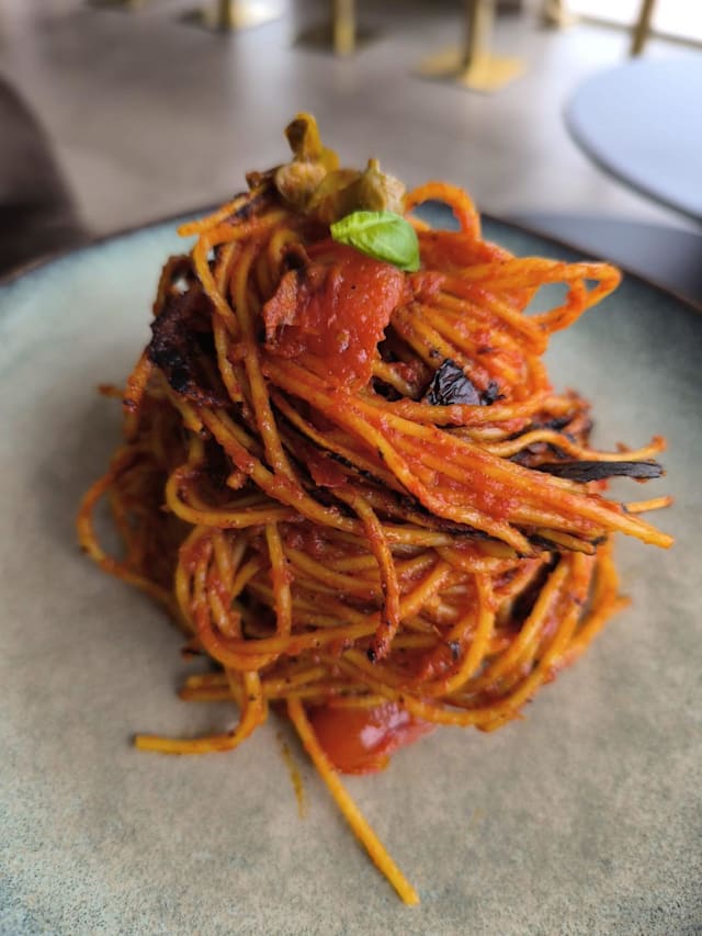 Pasta fresca lunga, gratinata in forno con pancetta e zucchina e crema di pomodoro