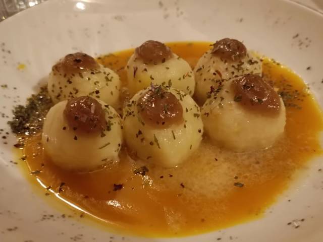 - Gnocchi ripieni di strachitutn, pesto di noci e crema di zucca