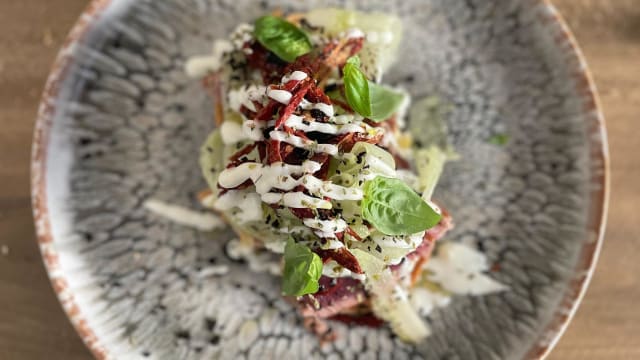 - In crosta di pane panko, con crema di patata mantecata e salsa rustica di peperone, polvere di capocollo f.lli Gentile.