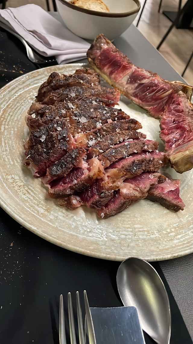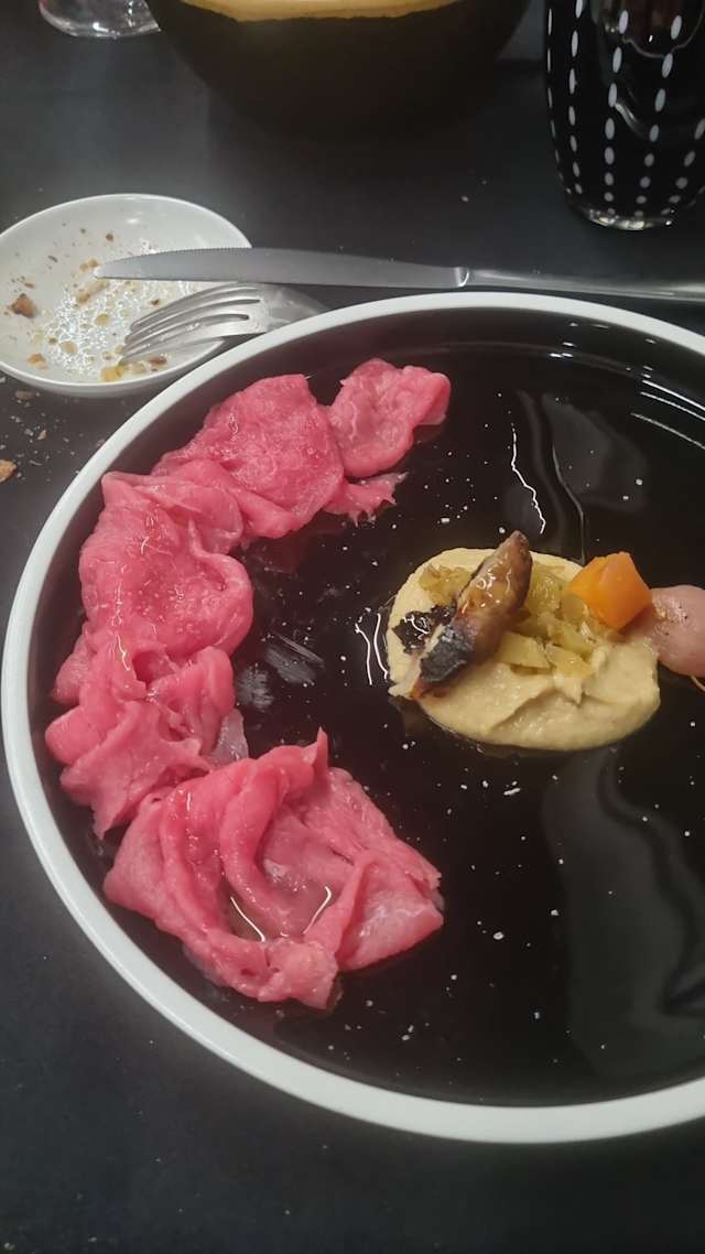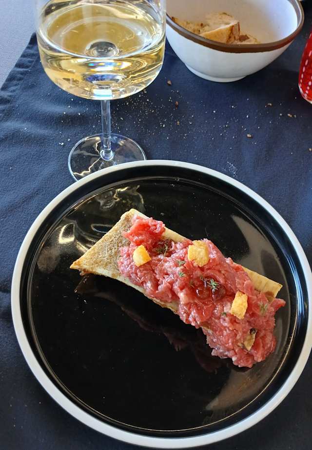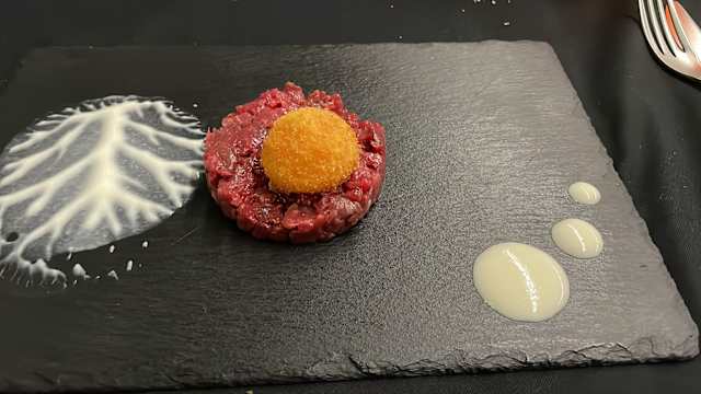 - Midollo alla brace, tartare di vacca vecchia, sfericazione di salsa teriyaki e pane croccante aromatizzato al burro e timo
