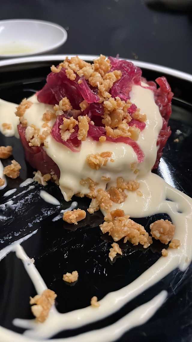 - Tartare di black angus salsa olandese, cipolla caramellata e noci di macadamia