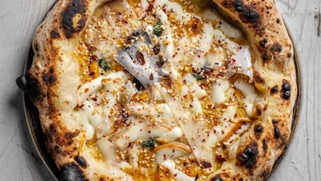 Fior di latte artigianale sori’ ,crema di topinambur, pere fresche conciate, noci di sorrento bio, spinacino bio, lardo di patanegra e crema di gorgonzola dolce.