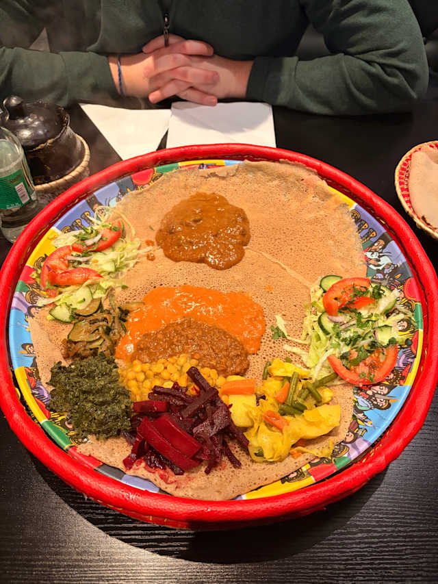 - (assortiment van vegetarische gerechten geserveerd op injera)