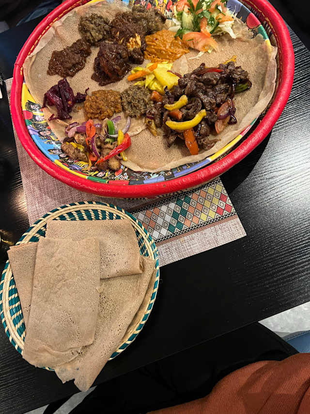 - (een heerlijk combinatieplateau met key wot of alecha tibs, doro wot en gomen besiga. Geniet van een verscheidenheid aan traditionele ethiopische vleesgerechten.)