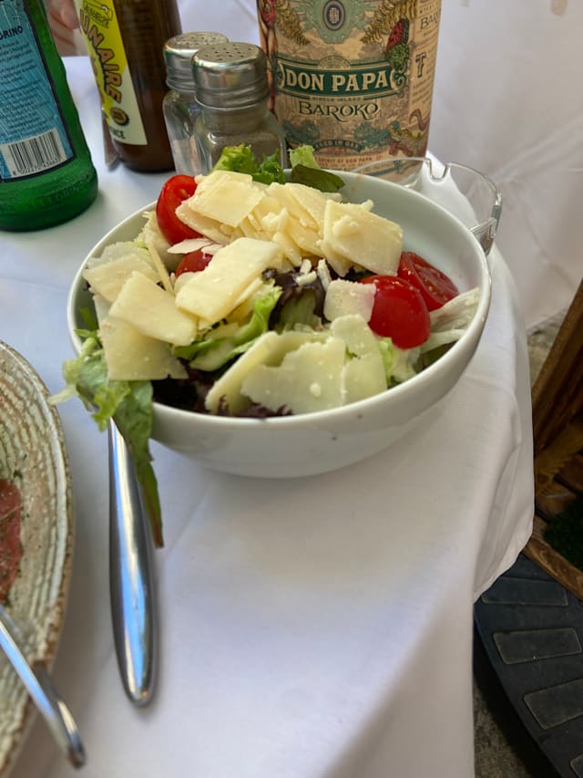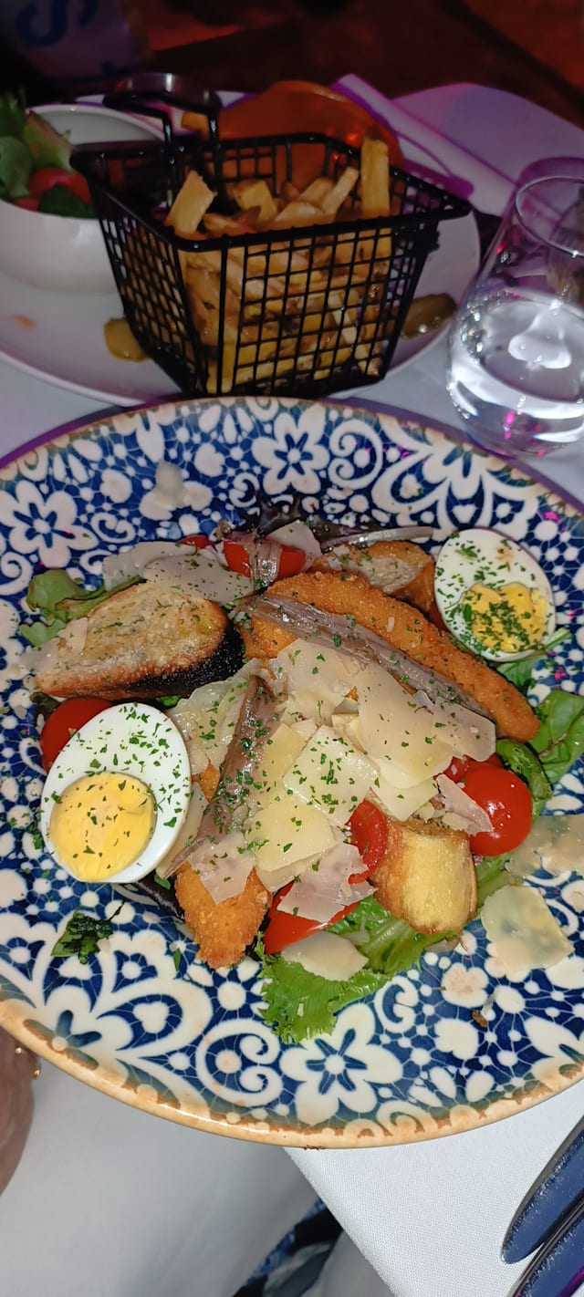 7/10Nice ambience in a small square full of restaurants. I ordered the chicken ceasar salad as it was a very warm evening. It was ok but the chicken was done in batter which was not to my taste. Otherwise service was good.