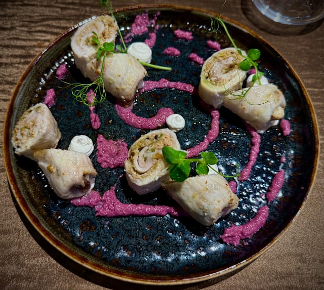 Patata della sila farcita con riduzione di nduja, julienne di capocollo calabrese e chips di pecorino calabrese
