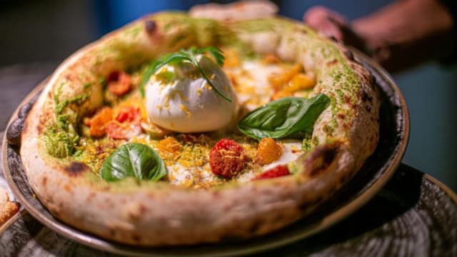 Una pizza che offre un'esperienza gustativa memorabile che celebra la freschezza grazie al fior di latte campano, al pomodoro san marzano disidratato, ai morbidi peperoni arrosto, alla cremosa burrata, la polvere di cappero, basilico e zest di limone