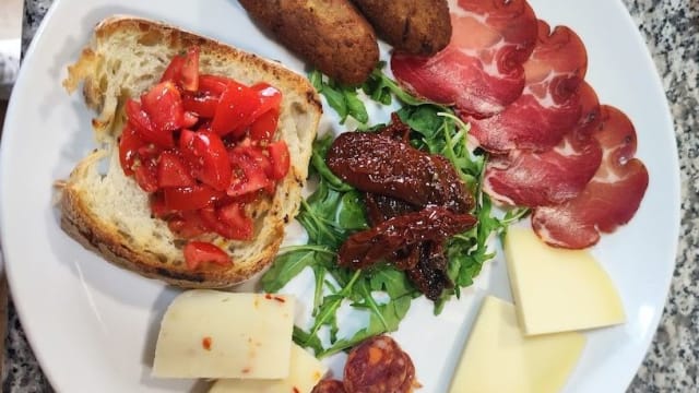 Misto formaggi, salumi locali, fritti vari (baccala fritto, polpetta di melanzana, polpettina calabrese in umido panzerottini, arancini, crocché, patate con buccia), salse, marmellate, parmigiana, bruschetta, fagioli salsiccia sbriciolata e parmigiana di zucchina. Minimo 2 persone