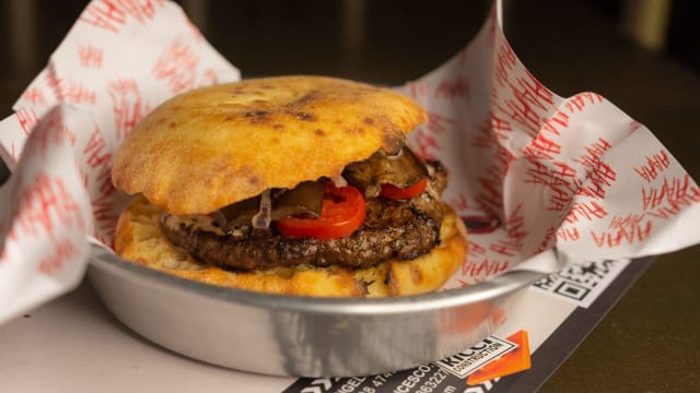 Hamburger di marchigiana gourmet 200g, pesto di basilico, bocconcini di mozzarella di bufala DOP, provola di agerola DOP, pomodorini secchi, tarallo napoletano tradizionale