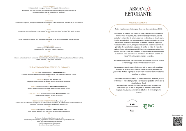 10/10I took my staff for dinner to celebrate our success and the team at Armani were really welcoming. They spoke English to accommodate our level of French and took us on a culinary journey. Both menus (food and wine pairing) were amazing. Thank you.
