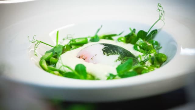 Melanzana alla bandiera, salsa di datterini, hummus di mandorle, cipolla, gel di friggitelli.