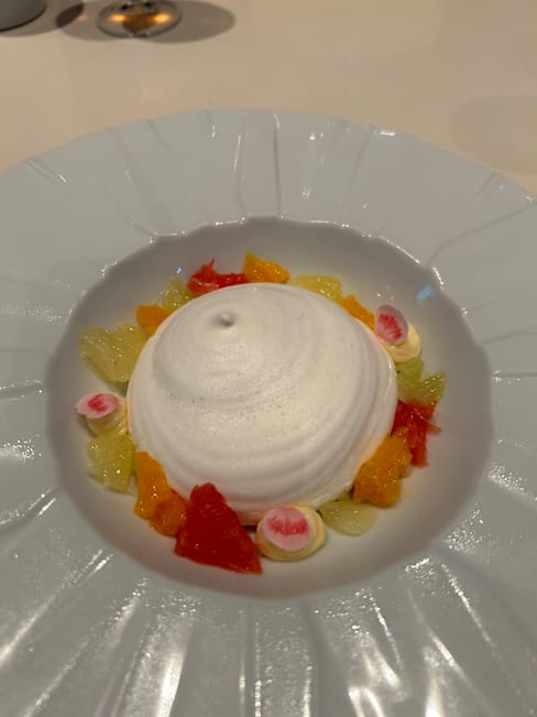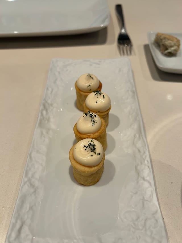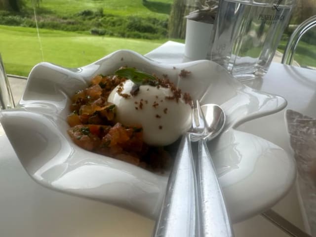 7.5/10+2We were a bit disappointed in what we hoped would be a Michelin-star-adjacent experience. We got the 66 € tasting menu and a kids meal. On the positive side, our waitress was very nice and the kids meal was terrific. And the food was presented very well. The veal croquettes were excellent. But sadly the food wasn’t quite up to par with what we expected. Some misses: the patatas bravas lacked spice, the entrecôte had a tough sinew through much of it, the panna cotta was largely dissolved, the meringue in the pavlova was hard as a rock. And when I asked for bearnaise sauce with the steak we got hollandaise. At this price point, those kind of details matter. I think most aggravating was that we only got one entree for the two of us to share under the tasting menu, which struck us both as quite odd (considering the whole meal cost almost 200 €). I think they can do better.