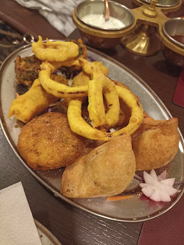 - 1 pz samosa, 1 pz palak pakora, 1 pz paneer pakora, 1 pz panjabi tikki 2 pz, onion rings