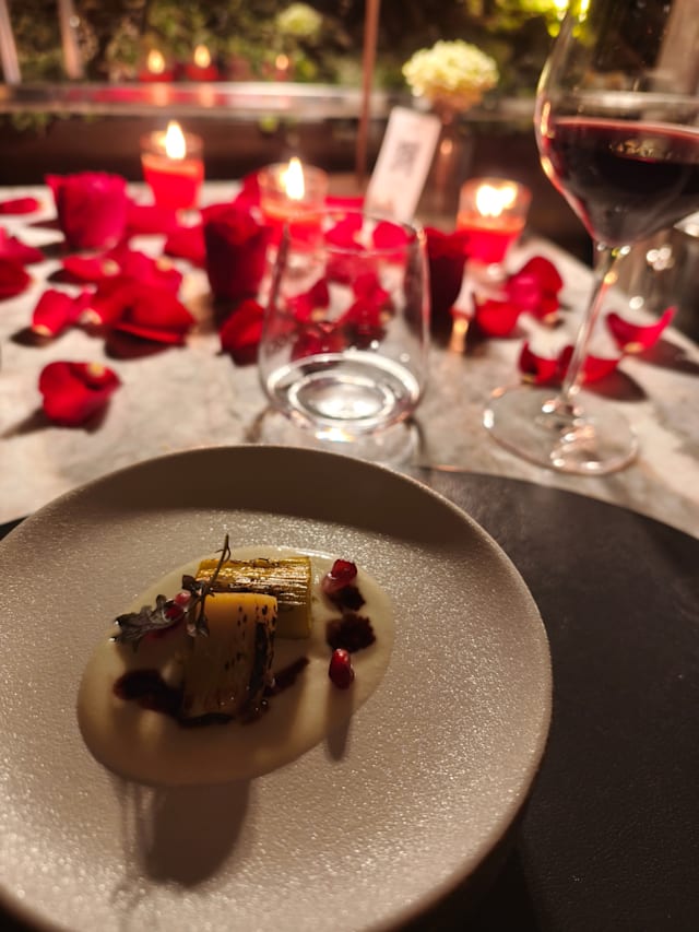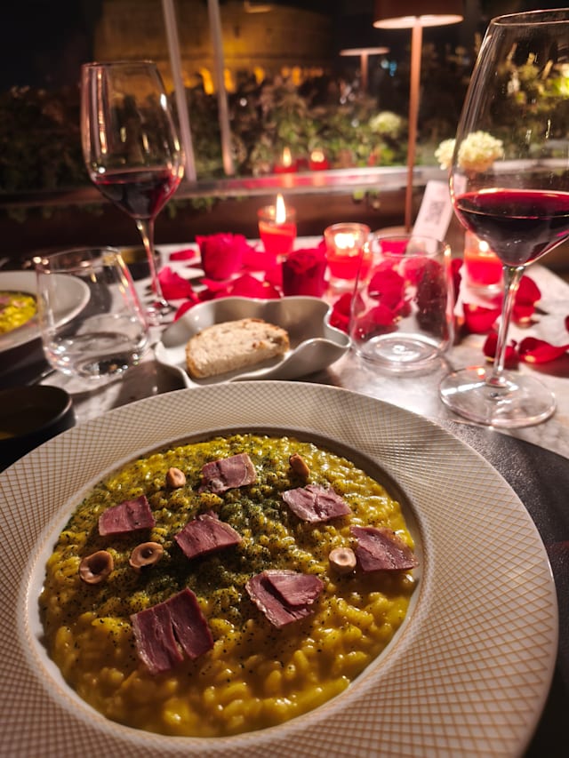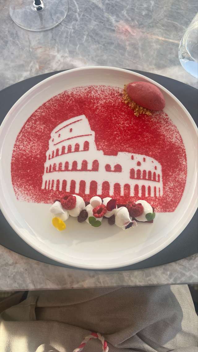 8.5/10We had a very good lunch at Aroma, really enjoyable. We've got a corner spot on the terrasse and the weather was delight full. There was a mixup with the water, put our waiters made a quick fix an all in all we were very pleased with the water, wine pairing and service. Signatur dish with the logo of the colosseum a raspberry dessert. Beautiful made but a little to doll in flavor. luckily our glas served with that compensated for it.