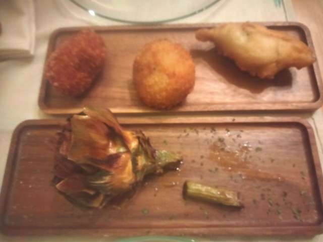 Involtini di peperoni, polpette di pane e polpette fritte, involtini di melanzane, crocche di patate, fave e cicoria