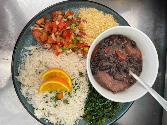 - Cassoulet avec du riz, farofa, choux vert, orange et vinagrette.