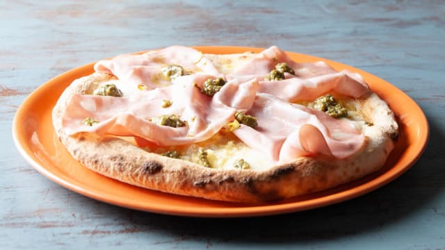 Bianca, patate, mortadella e pesto di pistacchio
