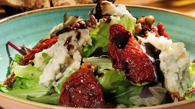 - Salade verte mêlée, noix, gorgonzola, vinaigre balsamique, tomates séchées