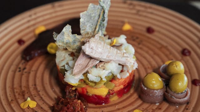 Ensaladilla cremosa de atún rojo con encurtido casero, huevas de arenque, alcaparrones, emulsión de kimchi y tostas de regañá