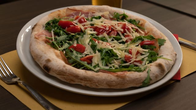 - Passata, mozzarella, crudo, rucola, pomodorini, grana.
